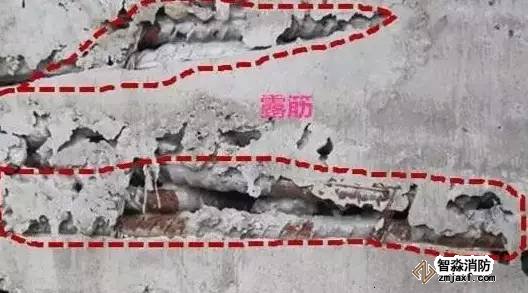 露筋即鋼筋沒有被混凝土包裹而外露。主要是由于未放墊塊或墊塊位移、鋼筋位移、結構斷面較小、鋼筋過密等使鋼筋緊貼模板,以致混凝土保護層厚度不夠所造成的。有時也因缺邊、掉角而露筋。