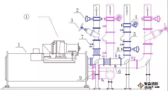 冷水機(jī)組常規(guī)接管圖:1-冷水機(jī)組,2-電動(dòng)閥,3-平衡閥,4-蝶閥,5-Y 型過濾器,6-泄水閥,7-壓力表,8-溫度計(jì),9-軟接頭。