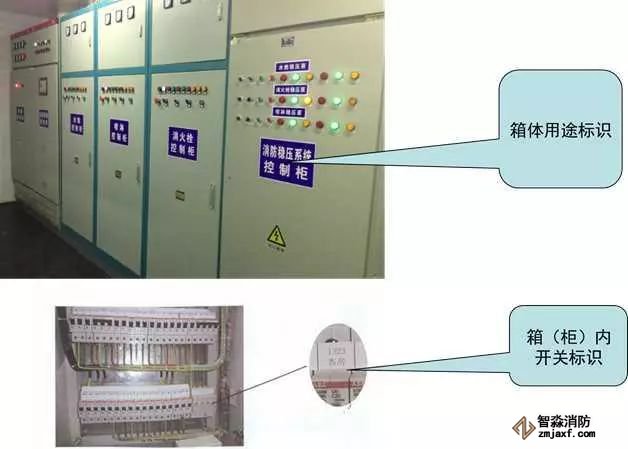 箱(柜)體標識采用自噴漆噴涂或用不干膠紙粘貼方式進行標識,字體寬度為40~45mm左右,內(nèi)容應(yīng)反映箱(柜)用途;箱(柜)內(nèi)開關(guān)采用背膠紙打印粘貼在空開上,應(yīng)反映控制對象的名稱;系統(tǒng)圖采用背膠紙打印,粘貼在箱(柜)門內(nèi)側(cè)合適位置,宜采用A4紙規(guī)格尺寸。