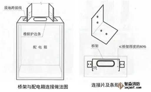 3、橋架與配電箱的連接:配電箱頂部劃線、鉆孔,用電鋸開條形孔,清理孔邊沿毛刺,孔兩端為弧形,兩端尺寸小于橋架寬度10mm左右,厚度小于等于橋架厚度的80%,孔中心與橋架中心對應(yīng),開孔處補漆,孔周邊粘貼橡膠條護口。箱體與橋架用1~1.5mm厚、90°的橋架連接片連接,連接螺栓絲頭朝外,加設(shè)專用墊片,刃面朝向橋架連接片,螺栓外露2~3扣絲。橋架與箱體采用4mm²黃綠雙色多股軟銅線或編織軟銅線接地跨接。