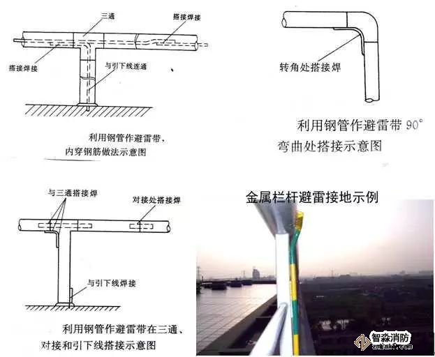 5、屋面金屬通氣管接地:采用鍍鋅扁鋼自屋面避雷網(wǎng)從透氣管根部引出,用抱箍沿透氣管固定,距根部或裝飾臺面間距300mm,根部與接地線連接,搭接長度不小于100mm,透氣管的連接部位做接地跨接。