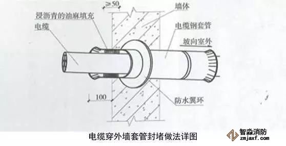 2、電源管穿外墻做法:在穿外墻位置敷設(shè)套管,宜內(nèi)高外低并設(shè)止水翼環(huán),管徑為電纜外徑的2倍,長度為每邊出墻面100mm。有散水時應(yīng)伸出散水外邊沿100mm,套管兩端制作喇叭口,內(nèi)壁刷防銹漆,外壁出墻刷瀝青漆。電纜穿入套管后,兩端嵌入瀝青麻絲,瀝青麻絲在套管內(nèi)填充密實,距管口深度大于50mm,并應(yīng)使電纜在套管內(nèi)居中。