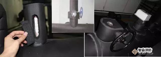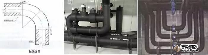 3、彎頭橡塑保溫:測量管道直徑及弧長,外側(cè)放樣尺寸為外弧長度加20~30mm。所有接縫用專用膠水粘接牢固,粘貼接縫應(yīng)放在彎頭內(nèi)側(cè)。接縫外粘5mm厚、30mm寬橡塑板條加強密封口。