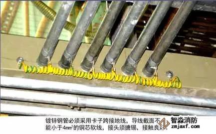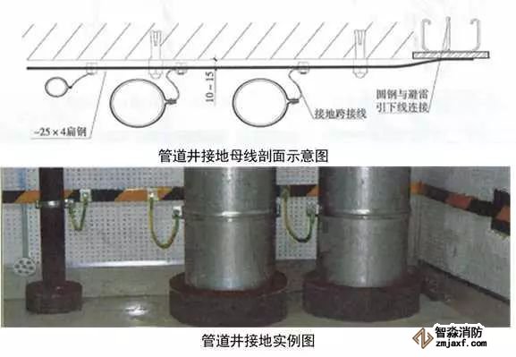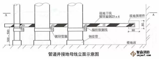 7、高層建筑管道頂部和底部接地:有接地預(yù)埋鋼板或垂直接地母線上引接接地母線,接地母線距地300~500mm,距墻10~15mm,并間隔100mm刷45°斜向黃綠相間油漆。將于管徑相匹配的接地抱箍安裝于管道上,抱箍必須與金屬體緊密接觸,編織軟銅線一端與抱箍連接,另一端與接地母線連接,螺栓連接處應(yīng)加平墊片和彈簧墊片。DN≥100mm時,采用10mm²編織軟銅線,DN≤80mm時,采用4mm²編織軟銅線。