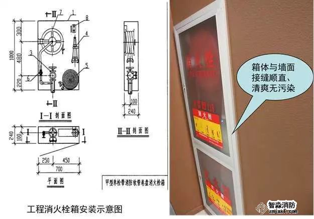 4、室內(nèi)消火栓箱安裝:暗裝消火栓箱安裝應(yīng)復(fù)核預(yù)留洞的位置、尺寸,將箱體置于預(yù)留洞內(nèi),箱體外表面距墻面應(yīng)保留裝飾面層厚度,箱體與洞口之間空隙填塞密實,抹壓平整。明裝消火栓箱安裝應(yīng)確定箱體在墻面上的安裝位置,找平、找正,用膨脹螺栓將箱體固定在墻上,固定點不少于四處。