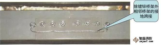 3、橋架進出線管:根據(jù)出線口位置,在橋架側(cè)面開孔,一管一孔。管端套5~6扣絲,與橋架連接內(nèi)外側(cè)采用鎖母固定,管口伸入橋架內(nèi)不大于5mm,導(dǎo)管與橋架采用不小于4mm²的軟銅線接地跨接。