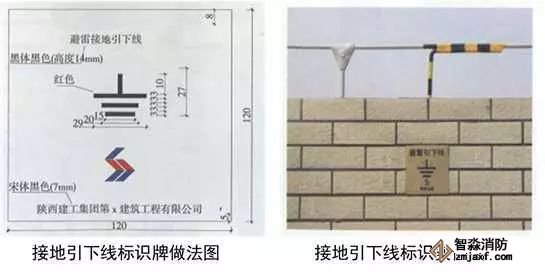 4、引下線標識:用厚度等于1mm的不銹鋼板加工制作標識牌,具體要求見圖;用黃、綠油漆對引下線進行相間標識,黃綠漆相間30~40mm;在引下線正下方距女兒墻頂面150mm處用云石膠粘貼標識牌,位置明顯,便于觀察。