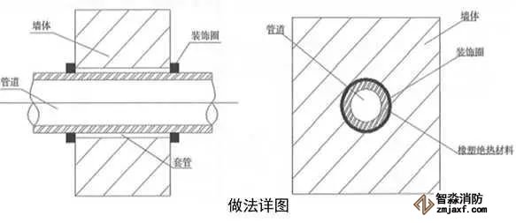 2、保溫管道穿墻處理:保溫管道穿墻、板時,保溫層應(yīng)連續(xù)。應(yīng)采用橡塑保溫管(板)進行穿墻、穿樓板保溫,用橡塑專用膠粘接牢固,接縫嚴密,兩端與墻面平齊,對接嚴密平整,兩側(cè)加牢固規(guī)整裝飾圈保護。保溫管(板)與墻、板面根部應(yīng)粘貼裝飾圈,接縫應(yīng)放在頂部或正視不明顯處,裝飾圈寬度20~50mm。