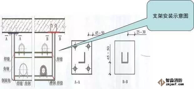 2)、固定支架宜設(shè)在主梁和次梁上,其設(shè)置方向應(yīng)同于其他支架。固定支架伸入梁的長度不宜小于200mm,固定點每側(cè)不少于兩個,上部固定點距支架頂端不宜小于50mm,底部固定點距梁底端不宜小于50mm,固定點間距不宜小于100mm,所有型鋼支架尖角必須倒成圓弧角。