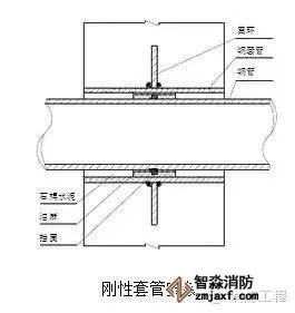 1.剛性套管安裝:主體結(jié)構(gòu)鋼筋綁扎好后,按照給排水施工圖標(biāo)高幾何尺寸找準(zhǔn)位置,然后將套管置于鋼筋中,焊接在鋼筋網(wǎng)中,如果需氣割鋼筋安裝的,安裝后必須用加強(qiáng)筋加固,并做好套管的防堵工作。剛性套管安裝如圖所示: