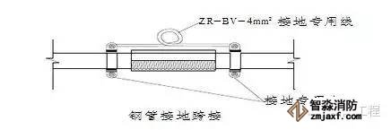 4.鋼管絲扣連接時(shí)在管接頭的兩端裝設(shè)專(zhuān)用接地跨接線(xiàn),如圖。