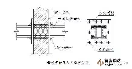 7.封閉插接母線(xiàn)在穿過(guò)墻及防火樓板時(shí),在母線(xiàn)周?chē)畛浞阑鸲铝?,具體做法見(jiàn)上圖。