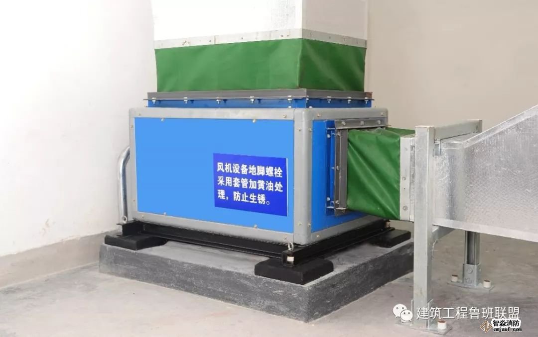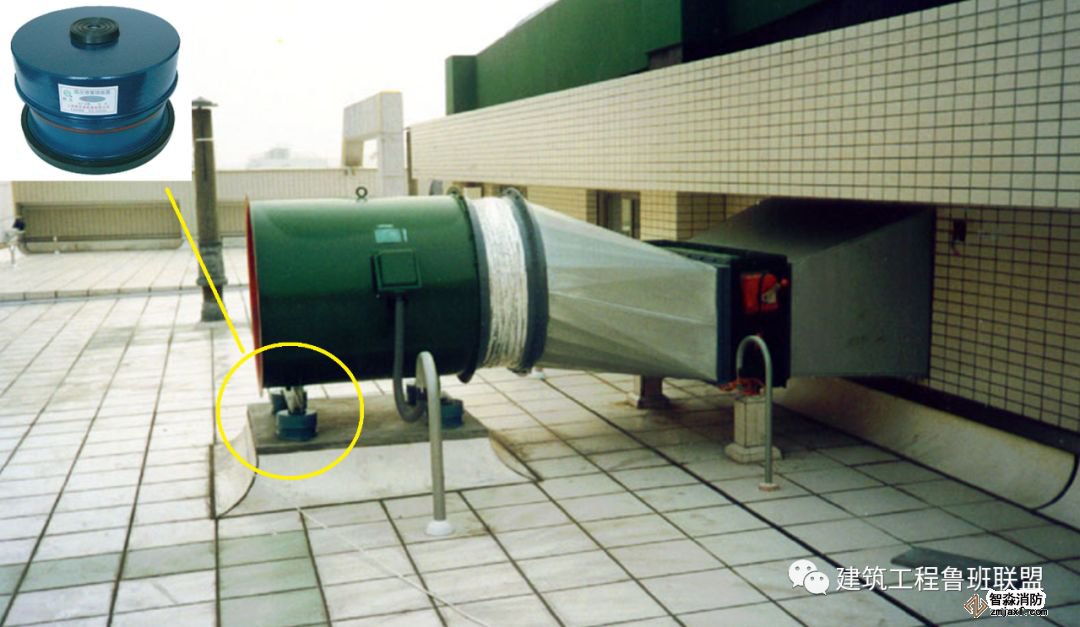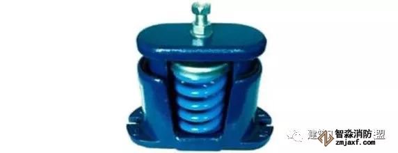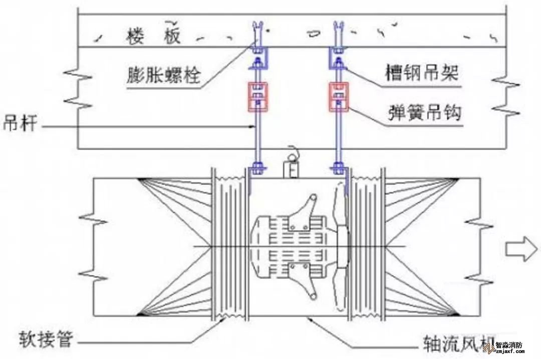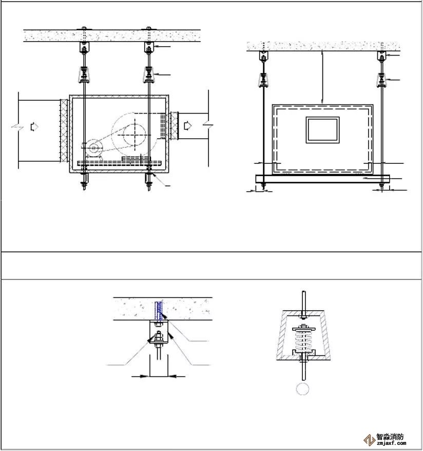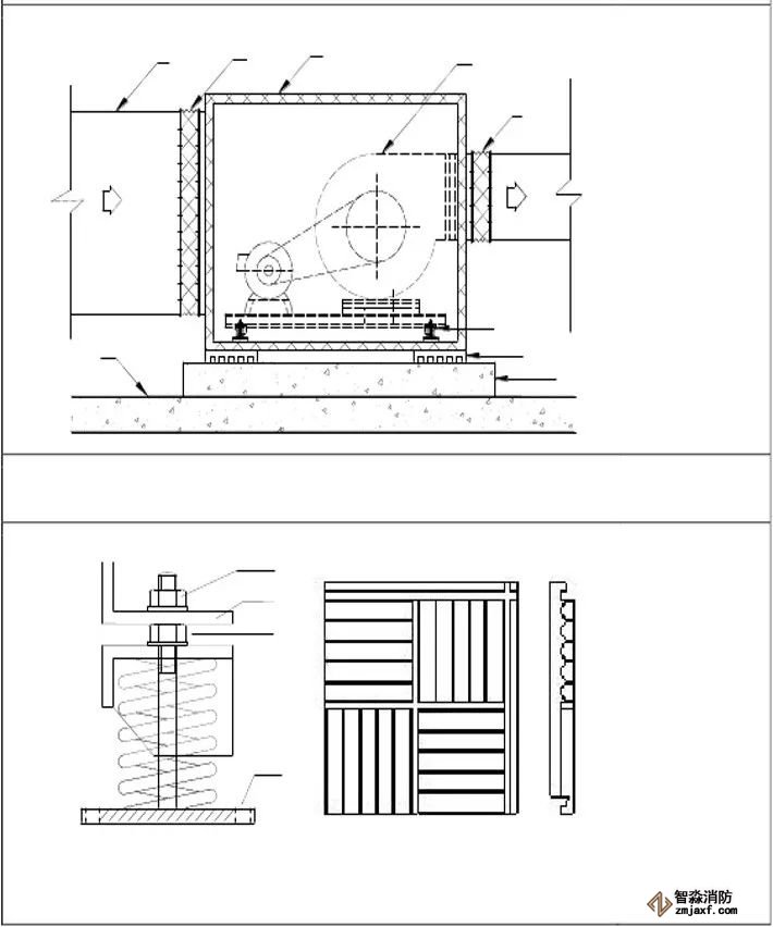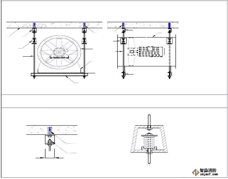 為防止軸流風機工作時擺動,用槽鋼做成框架固定在樓板上,圖為排風兼排煙風機下部設(shè)置阻尼彈簧減震器