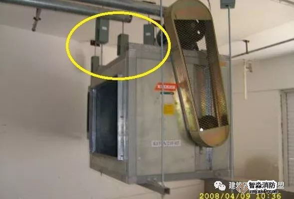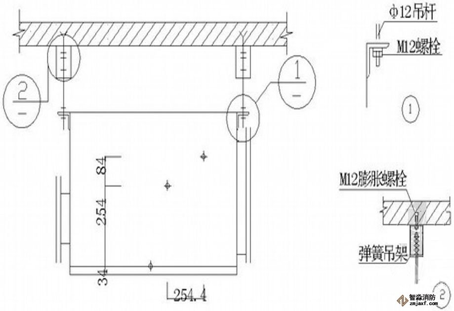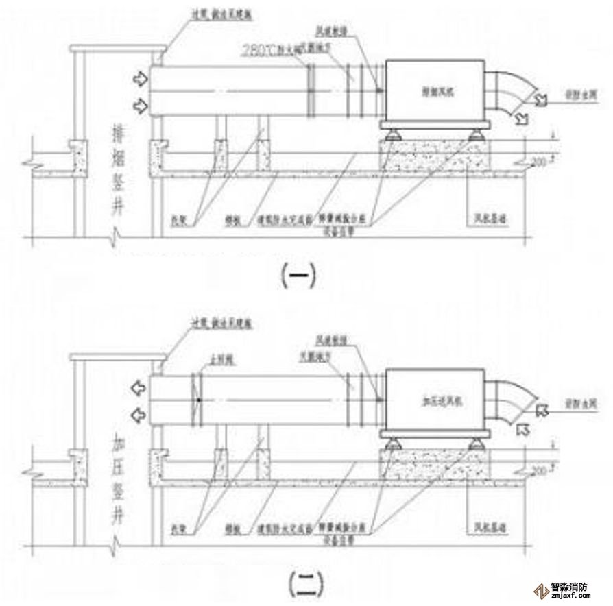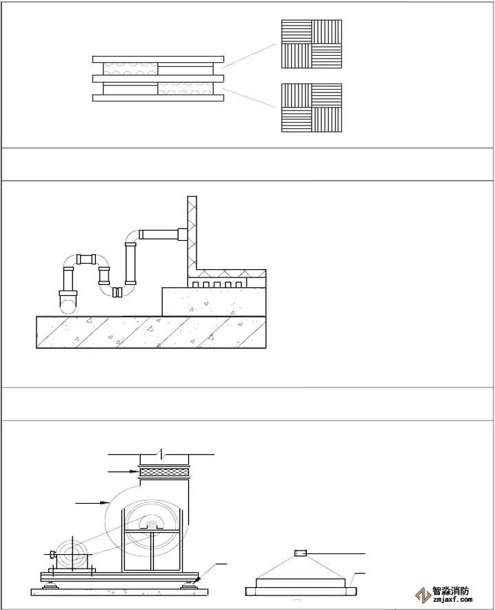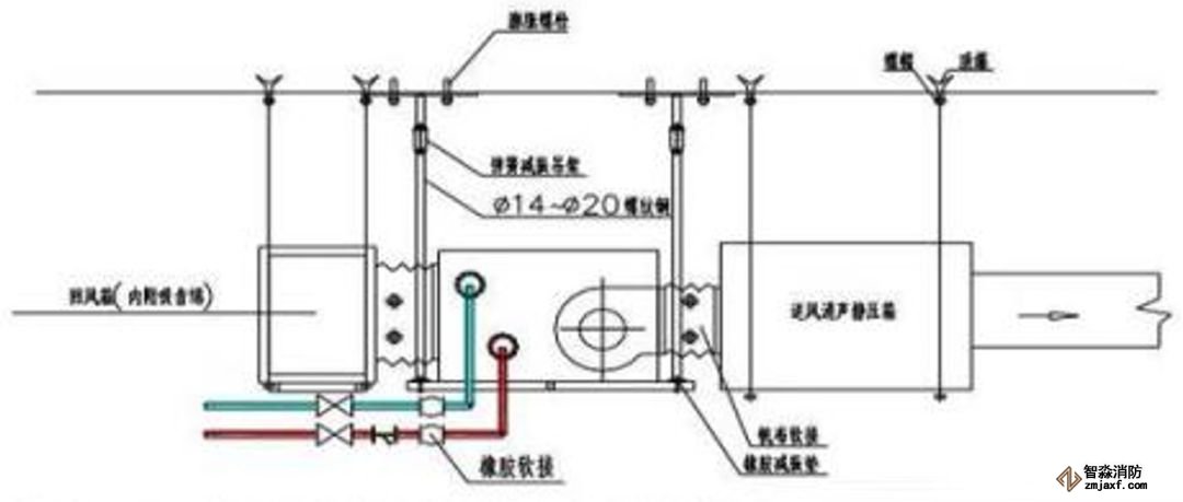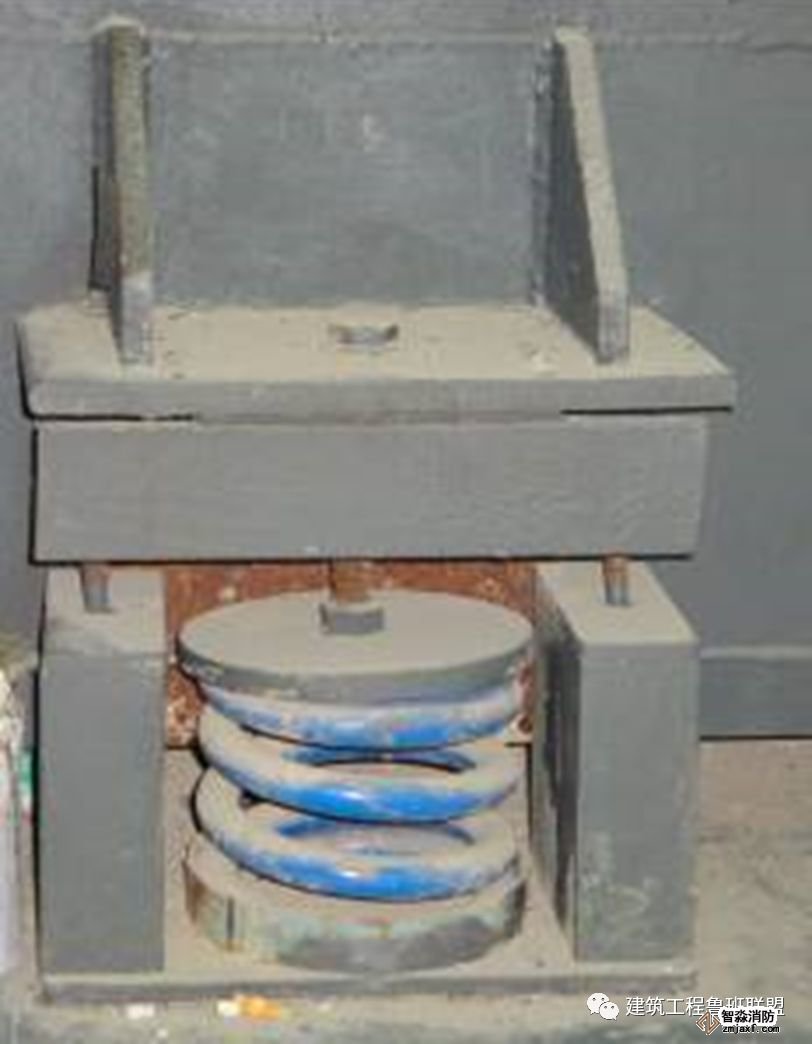 為防止軸流風機工作時擺動,用槽鋼做成框架固定在樓板上,圖為排風兼排煙風機下部設(shè)置阻尼彈簧減震器