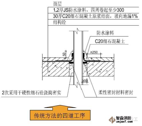 1、衛(wèi)生間排水管穿樓板安裝采用傳統(tǒng)留洞方法工序多、處理不當(dāng)容容易產(chǎn)生滲漏,使用成品防水套管可在結(jié)構(gòu)施工階段一次性預(yù)埋防水套管,工序簡(jiǎn)單,固定容易、可靠,不易發(fā)生位移,防滲漏效果明顯。由于衛(wèi)生間滲漏是業(yè)主投訴的主要問(wèn)題之一,也是房屋建筑工程的通病之一,要解決此種滲漏問(wèn)題,一定要從“根”上徹底解決。