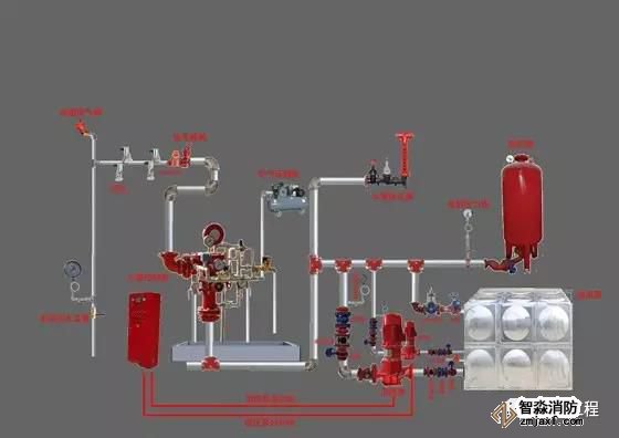保護區(qū)域出現(xiàn)火警時,探測系統(tǒng)首發(fā)動作,打開預作用雨淋閥以及系統(tǒng)中用于排氣的電磁閥(出口接排氣閥),此時系統(tǒng)開始充水并排氣,從而轉變?yōu)闈袷较到y(tǒng), 如果水勢繼續(xù)發(fā)展,閉式噴頭開啟噴水,進行滅火。這樣就克服了雨淋系統(tǒng)會因探測系統(tǒng)誤動作而導致誤噴的缺陷。如果系統(tǒng)中任一噴頭玻璃球意外破碎,則會從該 噴頭處噴出氣體,導致系統(tǒng)中氣壓迅速下降,降低監(jiān)控開關動作,發(fā)出報警信號,提醒值班人員出現(xiàn)異常情況,但預作用雨淋閥沒有動作,所以系統(tǒng)不會噴水,從而 克服了濕式系統(tǒng)會因噴頭誤動作所引起誤噴造成水漬的缺陷。