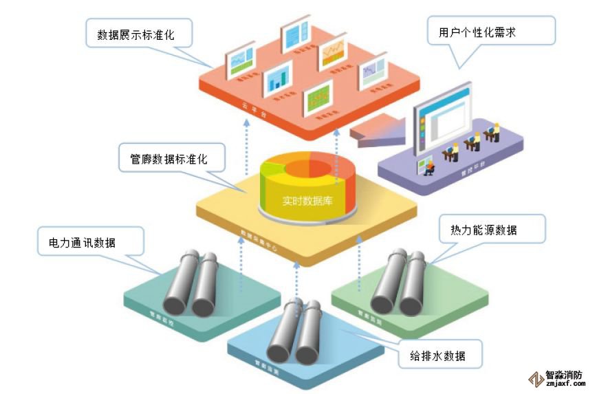 井下所有的信息都要傳到平臺(tái)監(jiān)控中心,而監(jiān)控中心的各種控制命令則要傳輸?shù)礁鞫喂芾鹊母鞣N設(shè)備上。在此基礎(chǔ)上,用戶可以很順利的處理來自不同設(shè)備及環(huán)境的數(shù)據(jù),滿足末端設(shè)備擴(kuò)展需求。管廊數(shù)據(jù)標(biāo)準(zhǔn)化、數(shù)據(jù)展示標(biāo)準(zhǔn)化、電力通訊數(shù)據(jù)、熱力能源數(shù)據(jù)、給排水?dāng)?shù)據(jù)、用戶個(gè)性化需求,利用物聯(lián)網(wǎng)對(duì)地下管廊進(jìn)行感知和識(shí)別,通過網(wǎng)絡(luò)互聯(lián)進(jìn)行傳輸、計(jì)算、處理和數(shù)據(jù)挖掘,實(shí)現(xiàn)對(duì)地下管廊的實(shí)時(shí)控制、精確管理和科學(xué)決策。