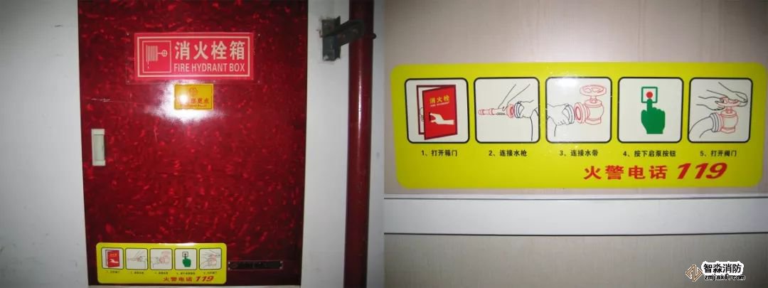 設(shè)置要求:在消火栓箱門中上部應(yīng)設(shè)置自發(fā)光式“消火栓箱”標牌,在中下部張貼操作方法圖例,圖例大小420×140mm。
