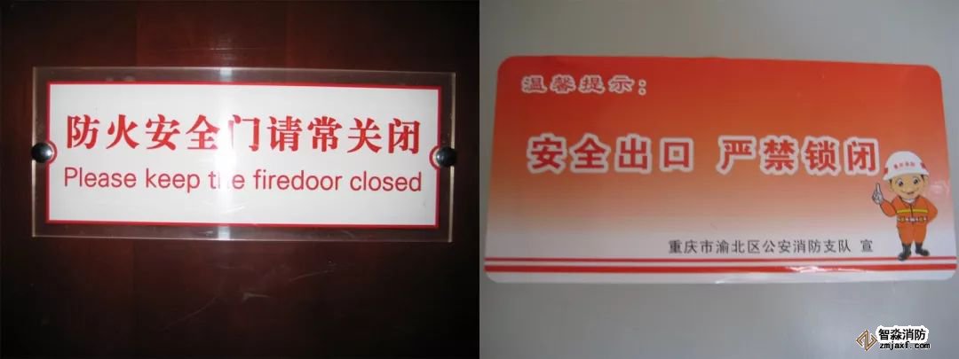 設(shè)置要求:在防火門中上部應(yīng)設(shè)置防火門保持常閉標牌,以及禁止占用等警示標語。