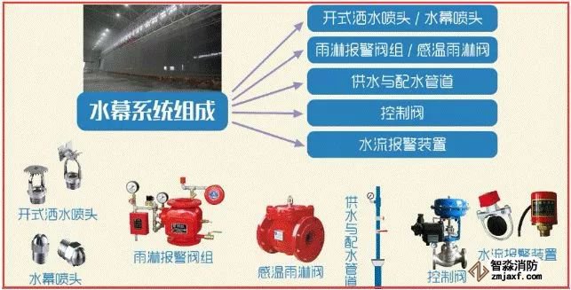水幕系統(tǒng)由開式灑水噴頭或水幕噴頭、雨淋報警閥組或感溫雨淋閥、供水與配水管道、控制閥以及水流報警裝置(水流指示器或壓力開關(guān))等組成。