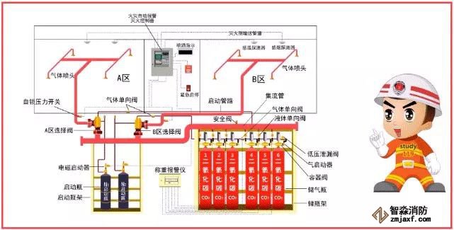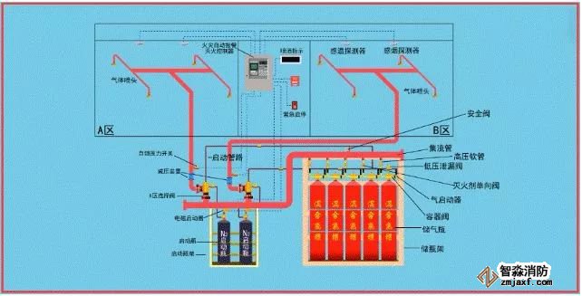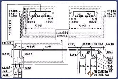 該系統(tǒng)由滅火劑瓶組、加壓氣體瓶組、驅(qū)動氣體瓶組(可選)、單向閥、選擇閥、減壓裝置、驅(qū)動裝置、集流管、連接管、噴頭、信號反饋裝置、安全泄放裝置、控制盤、檢漏裝置、管道管件及吊鉤支架等組成。