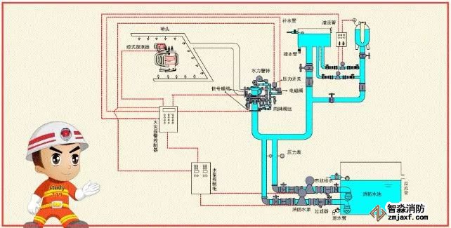 預(yù)作用系統(tǒng)與濕式系統(tǒng)、干式系統(tǒng)的不同之處,在于系統(tǒng)采用雨淋閥,并配套設(shè)置火災(zāi)自動報警系統(tǒng)。