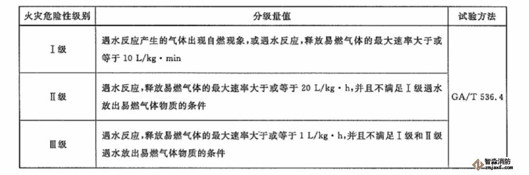 遇水放出易燃?xì)怏w物質(zhì)火災(zāi)危險(xiǎn)性分級(jí)方法見(jiàn)下表: