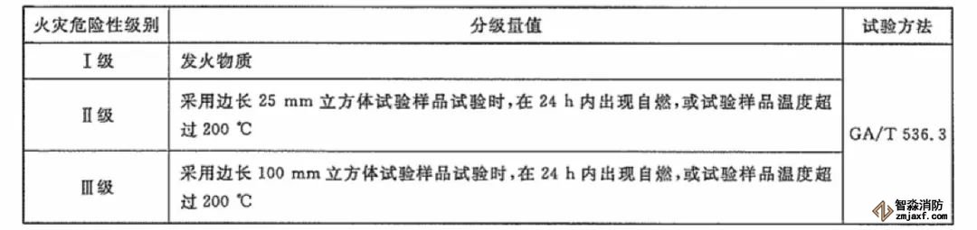 易于自燃的物質(zhì)火災(zāi)危險(xiǎn)性分級(jí)方法見(jiàn)下表:
