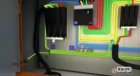 6、黃、綠、紅三相線分別從分配電箱的分路隔離開關(guān)引出,從N板接線端子引出淡藍色的工作零線,從PE板接線端子引出黃綠雙色保護零線。