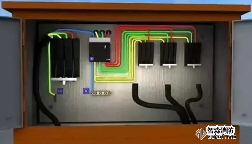 2、線路的黃、綠、紅三相線接入到二級分配電箱的總隔離開關(guān)上,淡藍色的N線接入到漏電保護器的N端上,通過漏保后接到工作零線端子板。