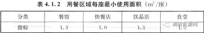 1、飲食或餐飲建筑可根據(jù)用餐區(qū)域的每座最小面積計算安全疏散人數(shù),用餐區(qū)域每座最小使用面積宜符合表4.1.2的規(guī)定。(4.1.2