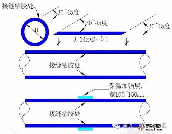 1、將順著管道方向保溫板接口由原來的900改為,采用300~450裁口粘膠連接,從而提高粘膠接觸面1.4~2倍。