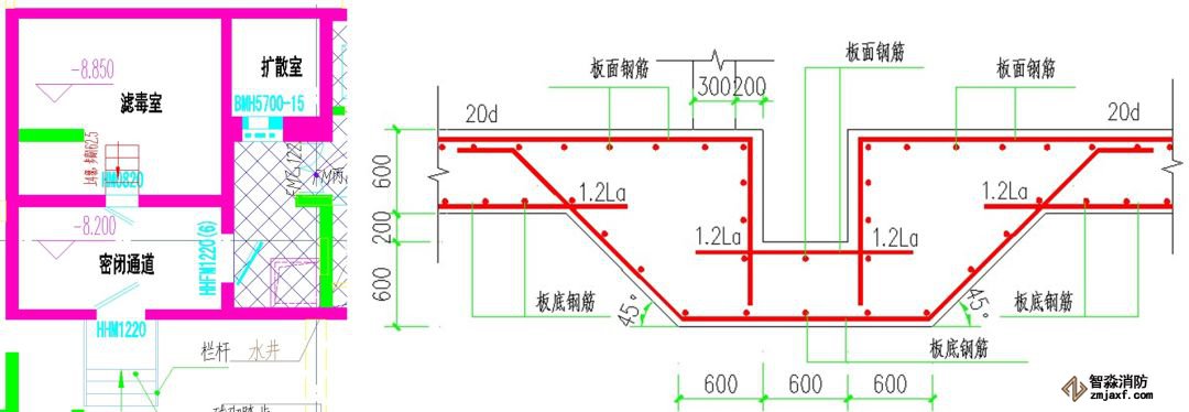 1)人防區(qū)內(nèi)梁板配筋圖紙一般由人防院設(shè)計,但模板關(guān)系(如洞口定位,梁定位、標(biāo)高)由民用院模板圖表達,所以梁板配筋應(yīng)結(jié)合兩院圖紙施工。