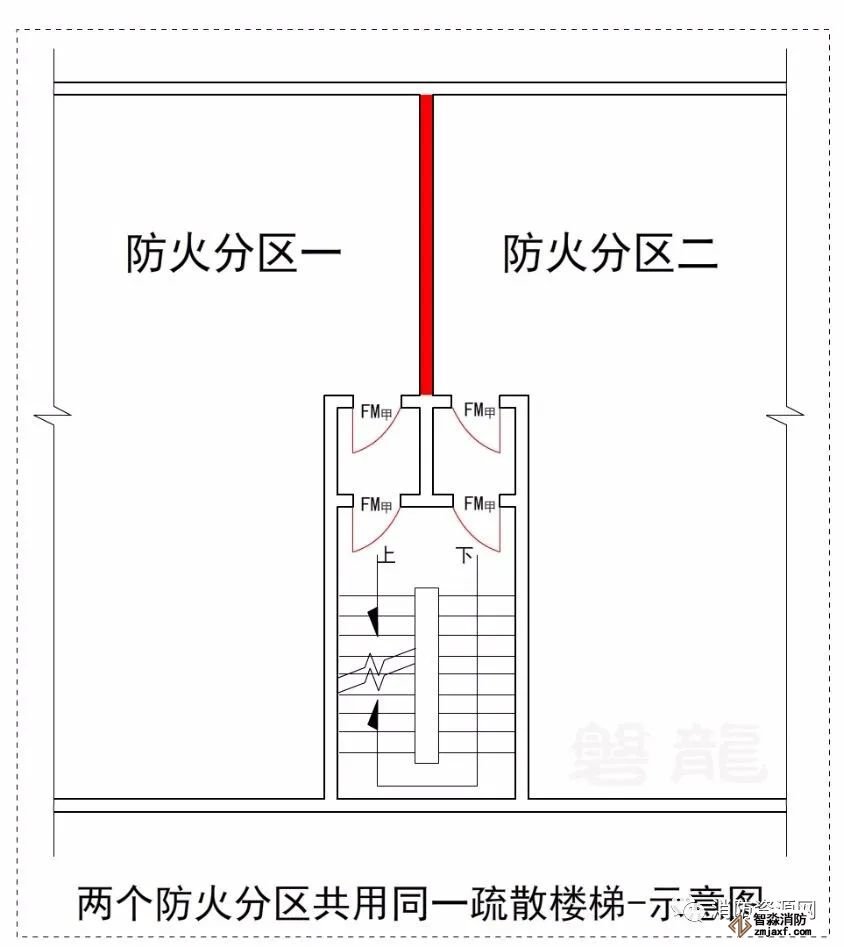 3.3 三個及以上防火分區(qū)不得共用同一部疏散樓梯。兩個防火分區(qū)共用疏散樓梯時應(yīng)分別設(shè)置前室,并應(yīng)符合防煙樓梯間的設(shè)置要求,開向前室的門應(yīng)為甲級防火門。