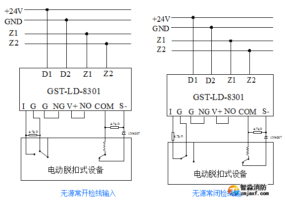 Z1、Z2:接火災(zāi)報(bào)警控制器信號(hào)二總線,無極性