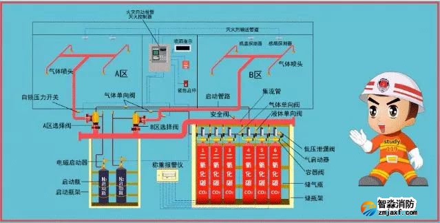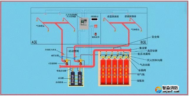 該系統(tǒng)由滅火劑瓶組、加壓氣體瓶組、驅(qū)動氣體瓶組(可選)、單向閥、選擇閥、減壓裝置、驅(qū)動裝置、集流管、連接管、噴頭、信號反饋裝置、安全泄放裝置、控制盤、檢漏裝置、管道管件及吊鉤支架等組成。