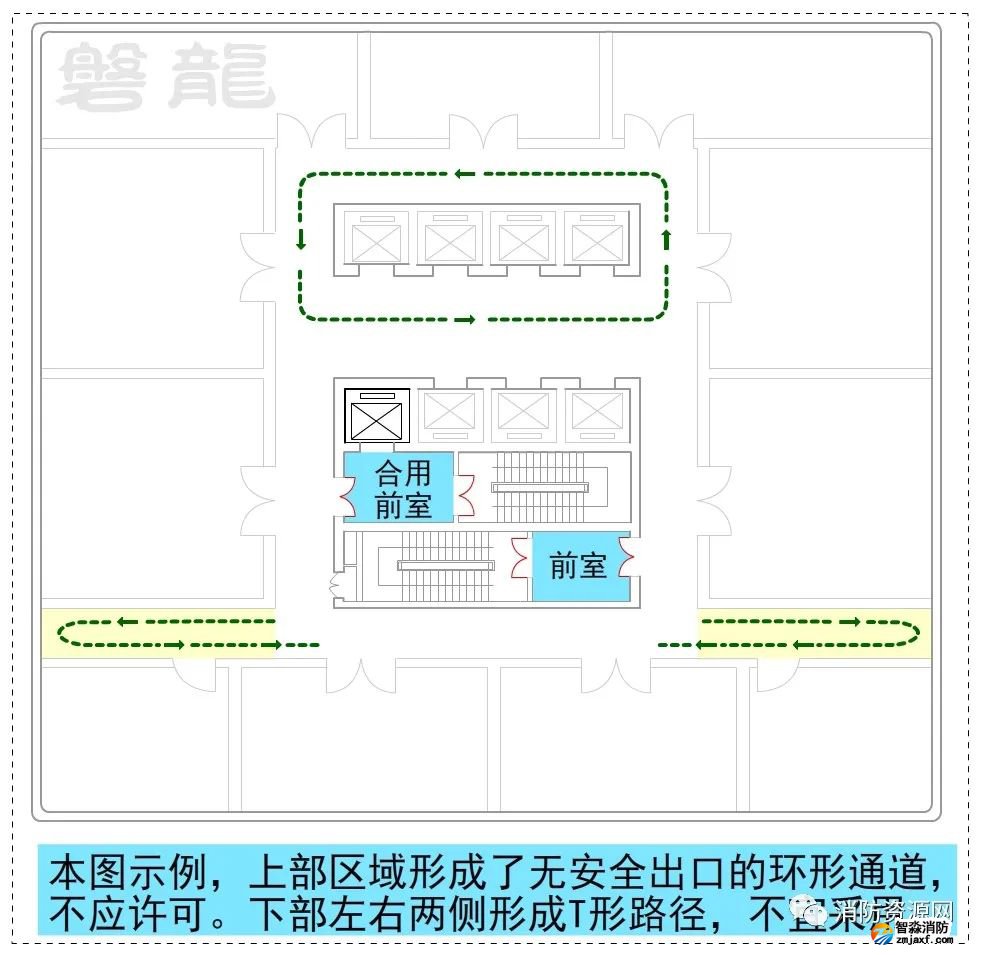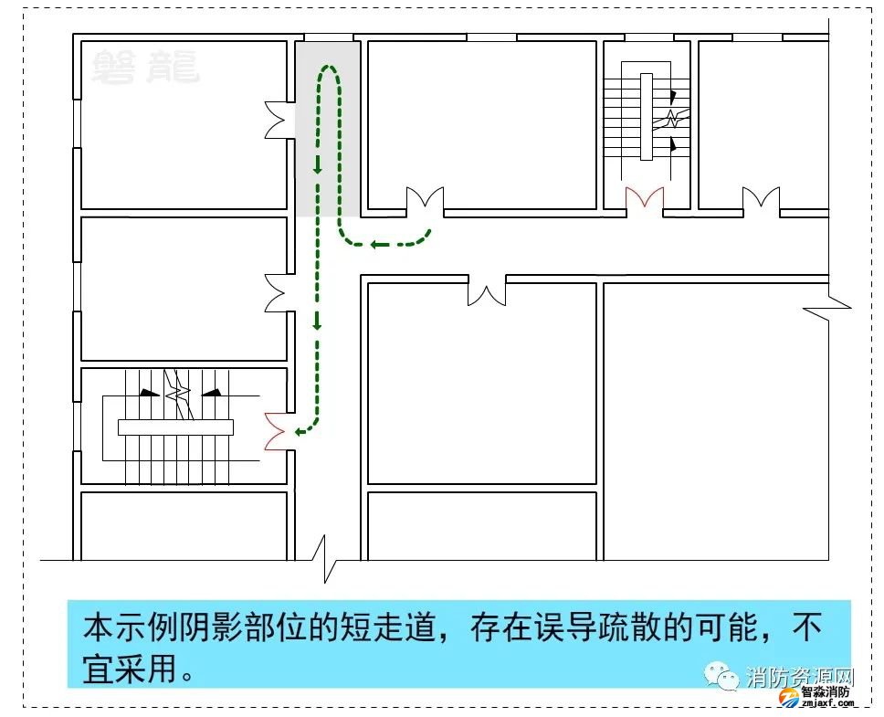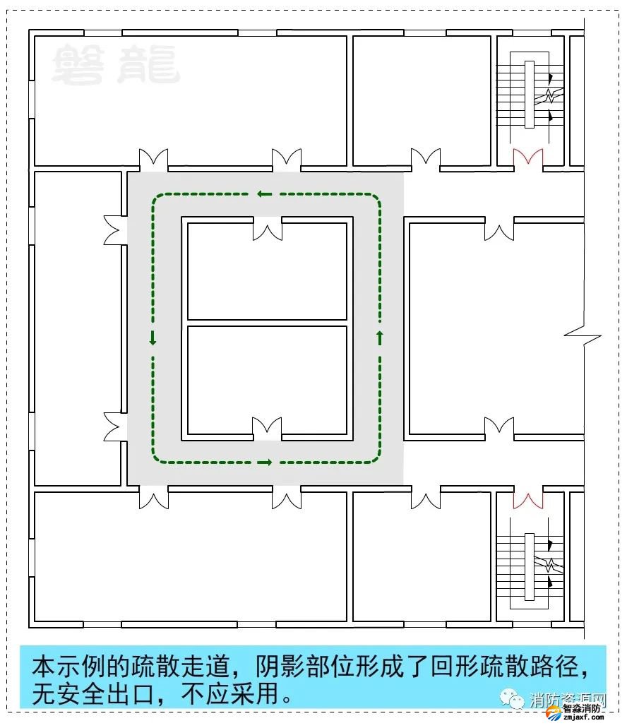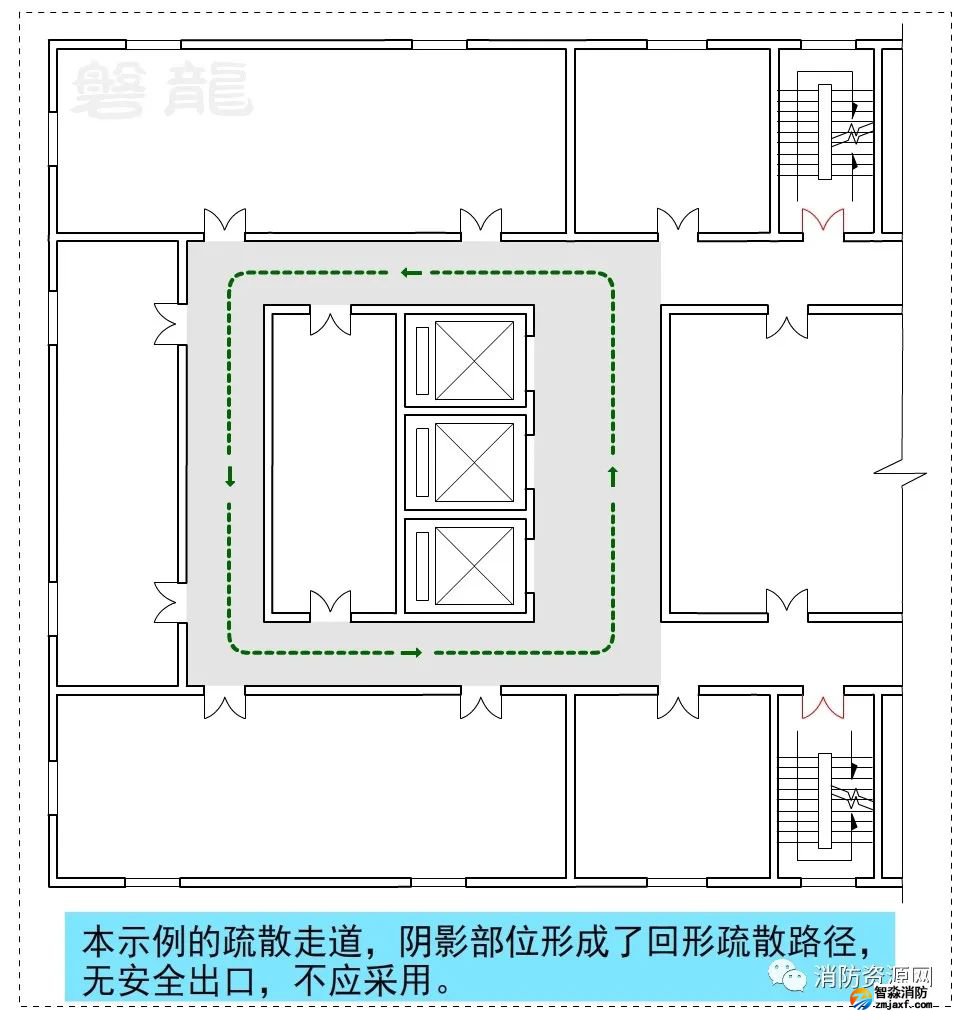 1、圖示9、圖示10所示的疏散走道,示例部位形成環(huán)形疏散路徑,沒有安全出口,不應(yīng)采用。