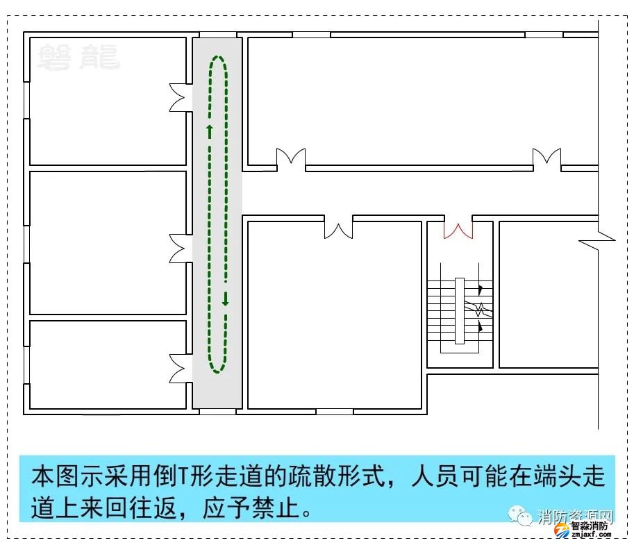 圖示6中,出現(xiàn)了倒T形走道的疏散形式,人員可能在端頭的走道上來回往返,應(yīng)予禁止。