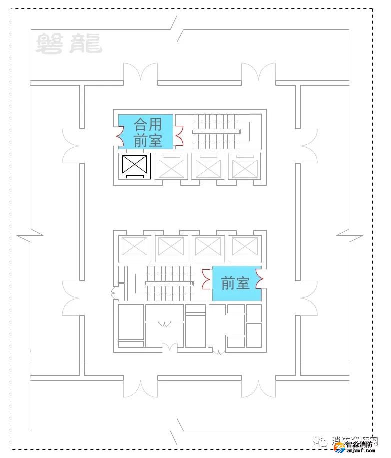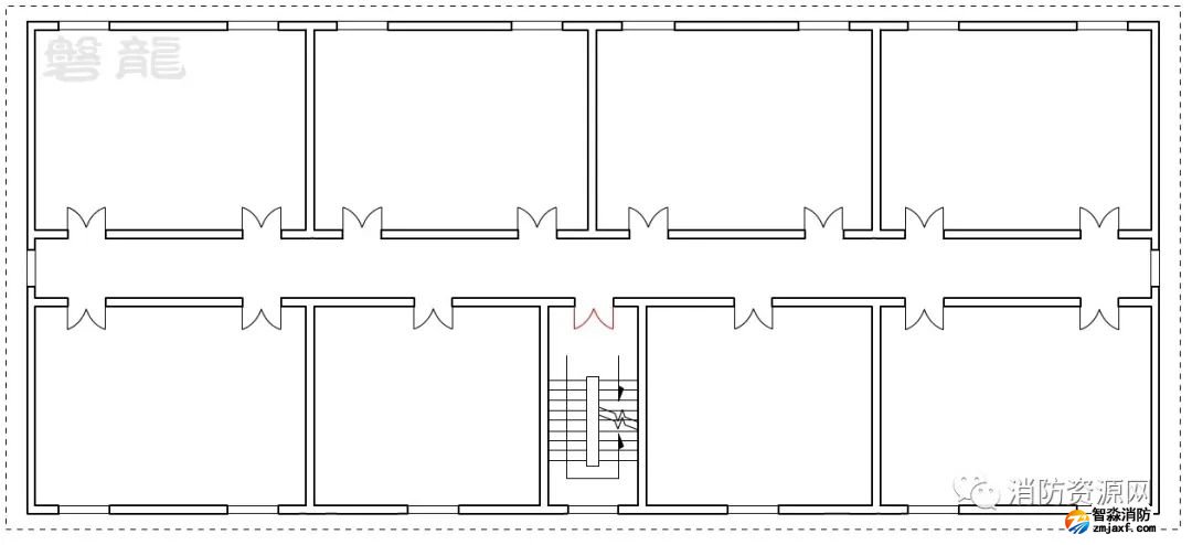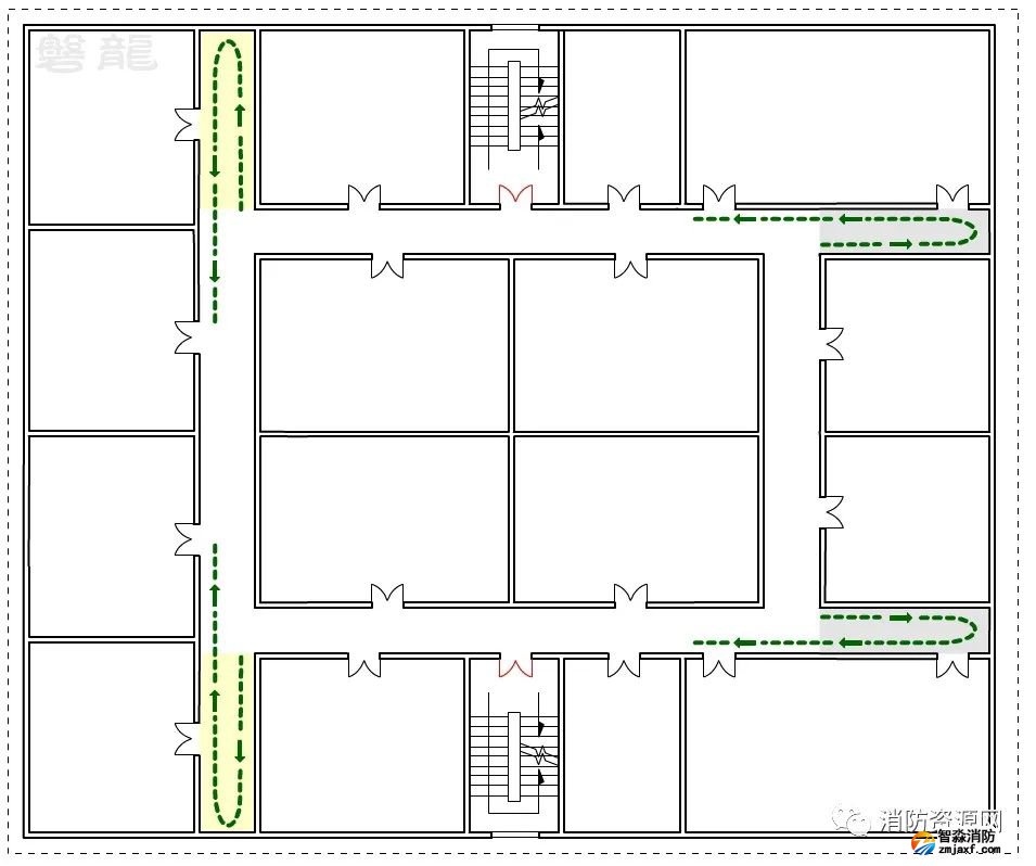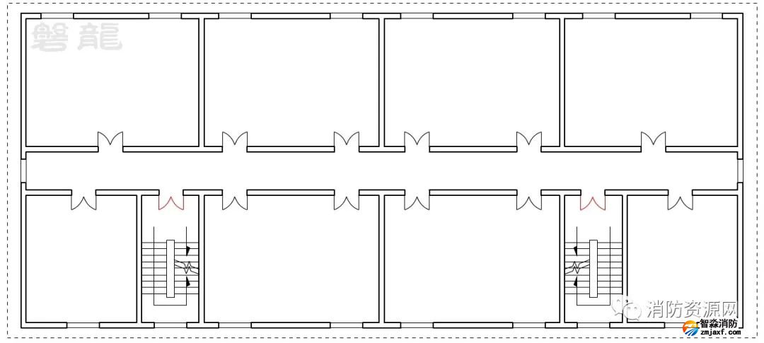 一、圖示1的疏散走道,設(shè)置有兩個疏散樓梯,兩個安全出口之間的疏散門具備雙向疏散功能,對應(yīng)走道為雙向疏散走道,安全出口兩端的走道為單向疏散走道,即袋形走道: