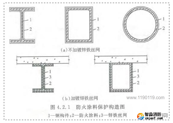 1、根據(jù)《建筑鋼結(jié)構(gòu)防火技術(shù)規(guī)范4.2.1執(zhí)規(guī)定,部分涂層內(nèi)應(yīng)設(shè)置與鋼構(gòu)件相連接的鍍鋅鐵絲網(wǎng)或玻璃纖維布: