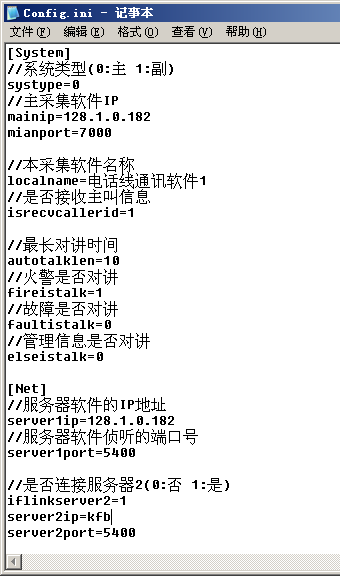serverlevel=0 //設(shè)置服務(wù)器的級(jí)別,當(dāng)此值設(shè)置0時(shí),服務(wù)器以主工作方式,投入接警運(yùn)行狀態(tài),當(dāng)此值為1時(shí),工作在備份模式,此時(shí)不處理接警。