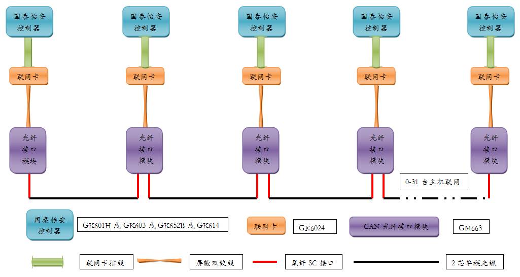 2) 串聯(lián)接線方式只須增加本公司GM663光纖接口模塊與聯(lián)網(wǎng)卡GK6024,每臺(tái)控制器配接2個(gè)。