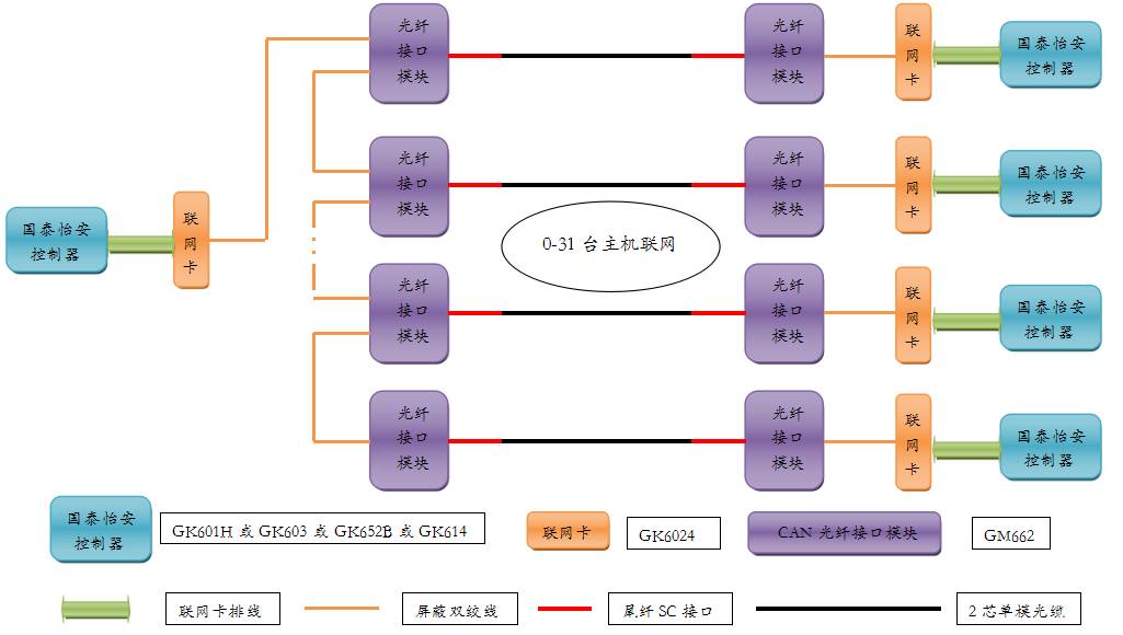 3) 星型接線方式控制器主機(jī)須根據(jù)對(duì)應(yīng)的控制器分機(jī)的數(shù)量決定GM662光纖接口模塊,如果控制器分機(jī)4臺(tái),那么主機(jī)配接接口模塊GM662數(shù)量為4,聯(lián)網(wǎng)卡為1,4臺(tái)分機(jī)配接接口模塊GM662數(shù)量為4,聯(lián)網(wǎng)卡為4。