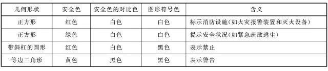 根據(jù)最新國(guó)家標(biāo)準(zhǔn)GB13495.1—2015《消防安全標(biāo)志第1部分:標(biāo)志》,消防安全標(biāo)志由幾何形狀、安全色、表示特定消防安全信息的圖形符號(hào)構(gòu)成。標(biāo)志的幾何形狀、安全色及對(duì)比色、圖形符號(hào)色的含義見(jiàn)下表。