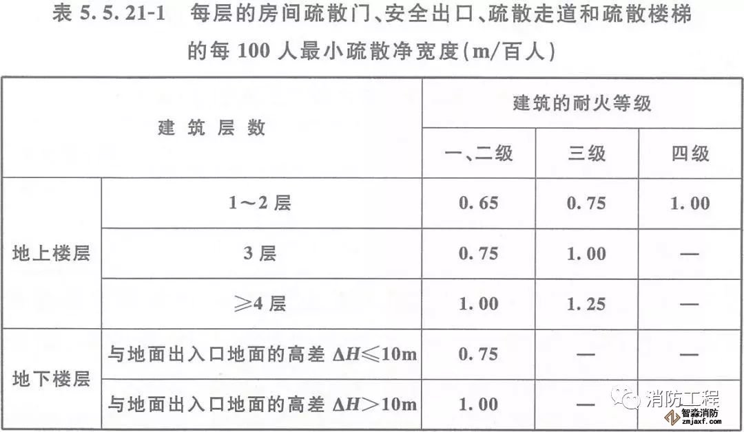 每層的房間疏散門、安全出口、疏散走道和疏散樓梯的各自總凈寬度,應根據(jù)疏散人數(shù)按每100人的最小疏散凈寬度不小于表5.5.21-1的規(guī)定計算確定。