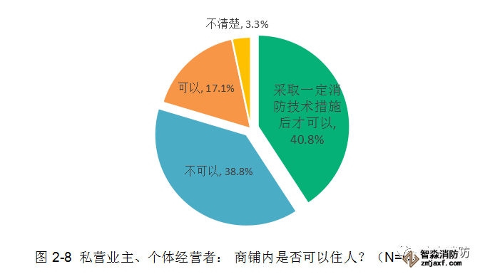 今年,廣東消防針對(duì)我省私營(yíng)業(yè)主和個(gè)體經(jīng)營(yíng)者展開(kāi)調(diào)查的數(shù)據(jù)顯示,有79.6%的受訪者對(duì)于“商鋪內(nèi)是否可以住人”這一消防知識(shí)有一定正確認(rèn)知:38.8%的受訪者明確表示商鋪內(nèi)不可以住人,約40.8%的受訪者表示采取一定消防技術(shù)措施后才可以住人,但仍有17.1%的受訪者存在錯(cuò)誤觀念,認(rèn)為商鋪內(nèi)可以直接居住。