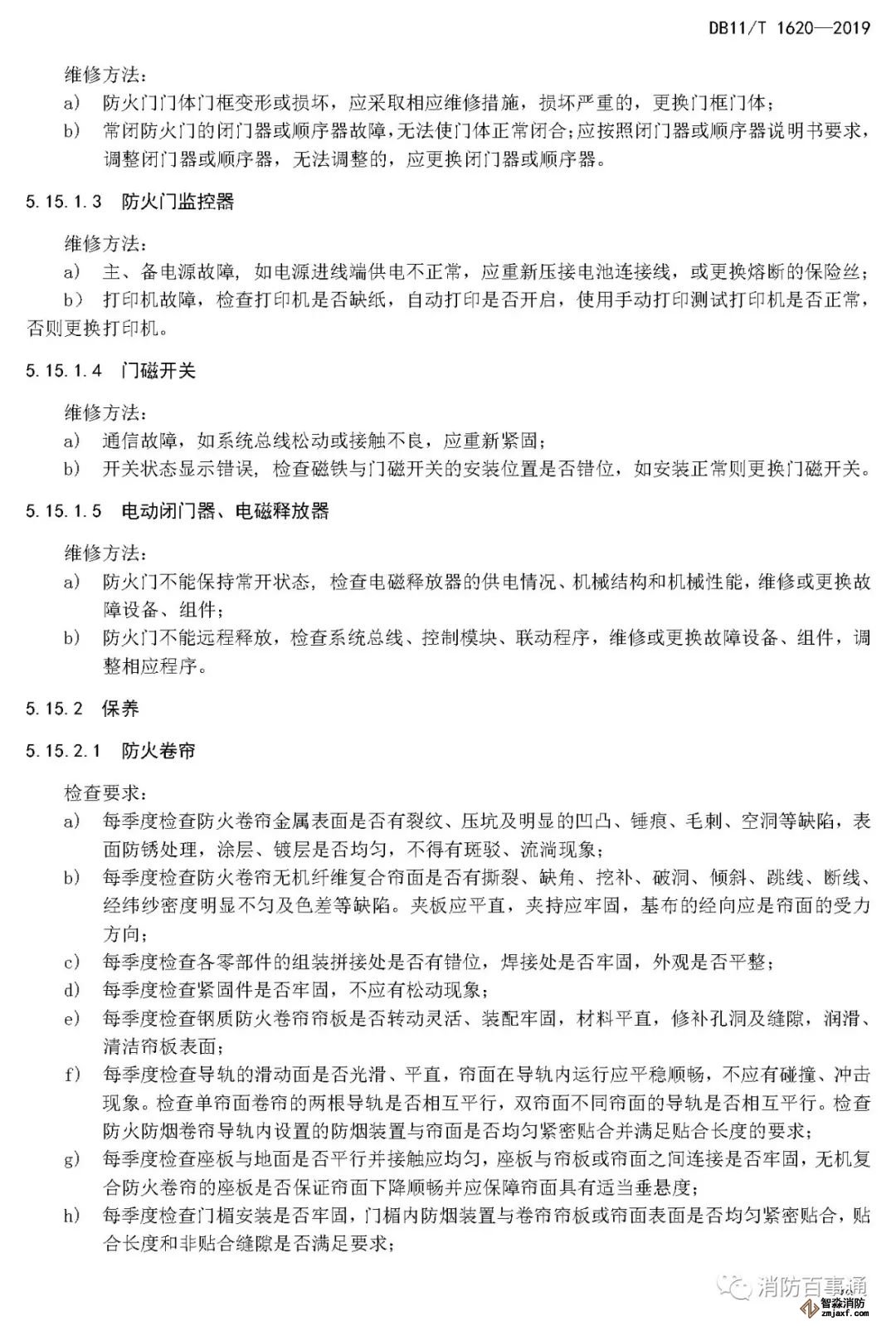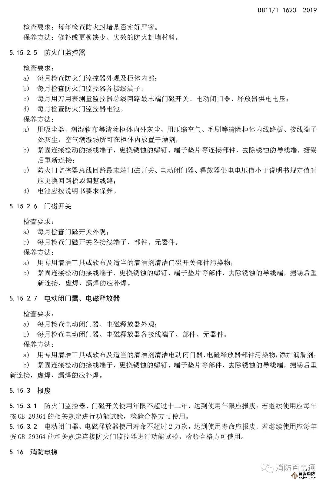 5.15.3.2 電動閉門器、電磁釋放器使用壽命不超過2萬次,達到使用壽命應報廢;若繼續(xù)使用應每年按GB 29364的相關規(guī)定連接防火門監(jiān)控器進行功能試驗,檢驗合格方可使用。