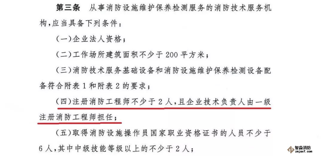 8月29日,應急管理部發(fā)布《消防技術服務機構從業(yè)條件》的通知,明確要求:從事消防設施維護保養(yǎng)檢測服務的消防技術服務機構,注冊消防工程師數(shù)量不少于2人,且企業(yè)技術負責人由一級消防工程師擔任。