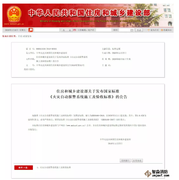 住建部公布了GB50166-2019《火災(zāi)自動報警系統(tǒng)施工及驗收標(biāo)準》,自2020年3月1日起實施。其中,第5.0.6條為強制性條文。原國家標(biāo)準《火災(zāi)自動報警系統(tǒng)施工及驗收規(guī)范》(GB50166-2007)同時廢止。