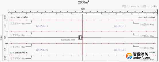 下圖是防火分區(qū)2000m2,使用FANFARE-2000探測(cè)主機(jī),分為4個(gè)探測(cè)區(qū)域(每區(qū)500m2),采樣孔保護(hù)面積25.2m2的管路設(shè)計(jì)圖